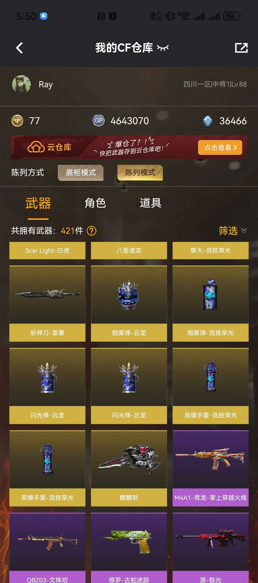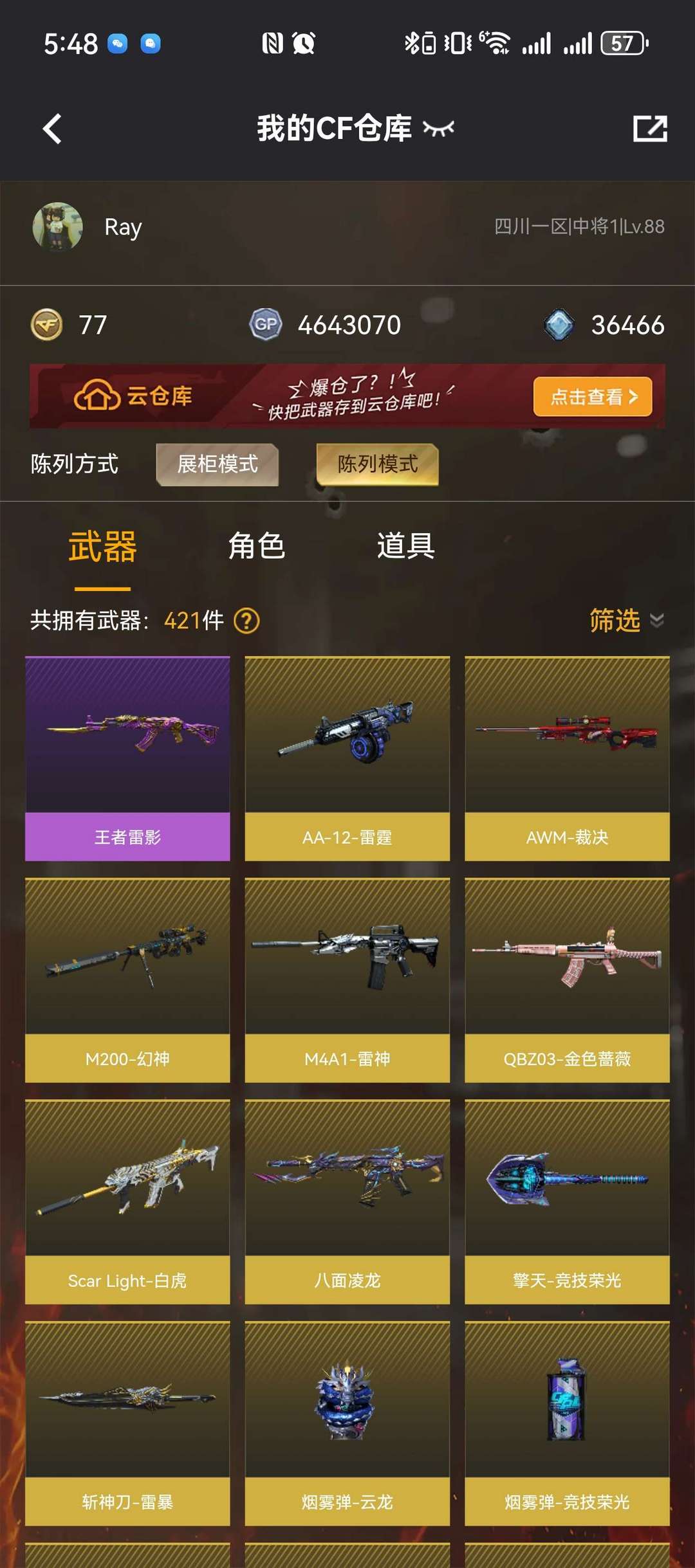 雷神,qbz金色蔷薇,白虎,均有皮肤。幻神传奇欧欧,awm裁决加音效卡八面玲珑满级(500子弹)
