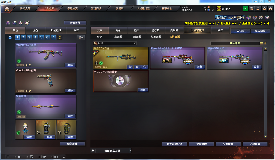 装备描述:宙斯套AG冠军皮肤幻神音效卡6烈蝴蝶6盘炼狱QBZ白虎裁决世冠套十冠军满皮肤满COP挑战满套装连杀6秒戒指