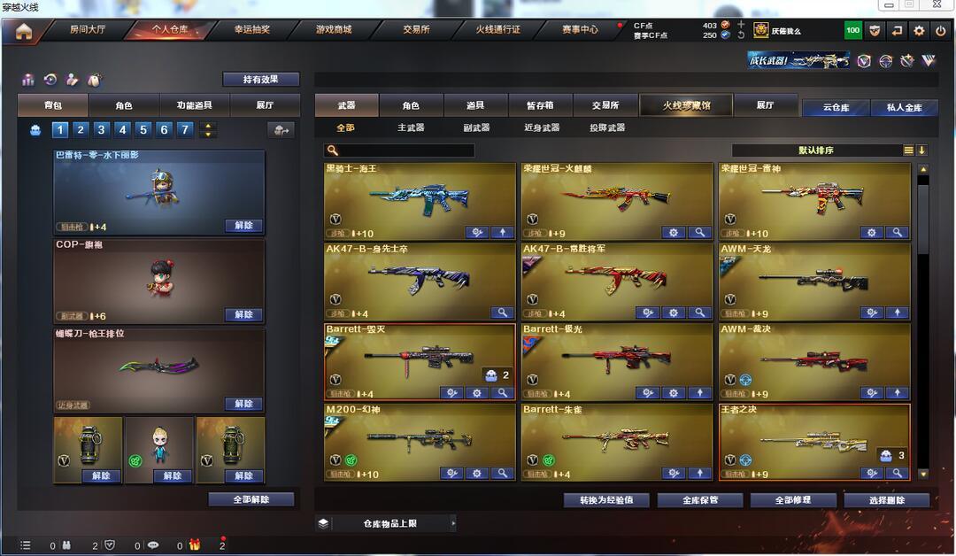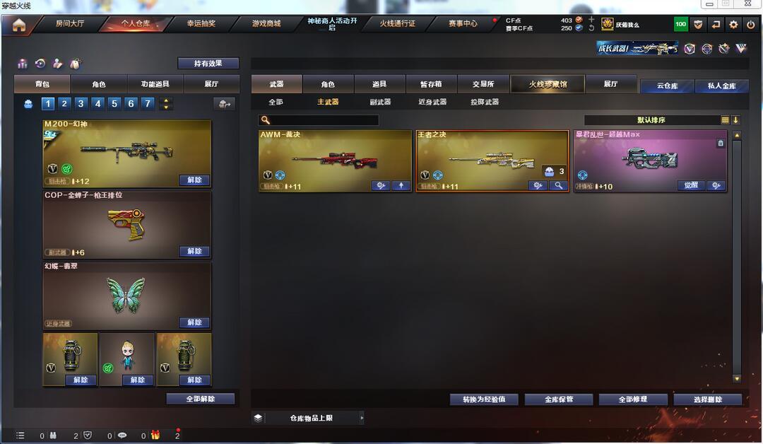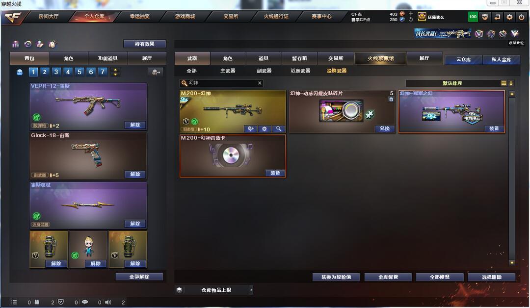 装备描述:冠军幻神音效卡宙斯套6烈蝴蝶6盘炼狱QBZ裁决白虎荣耀世冠套八冠军五音效卡雷暴套COP挑战满套装